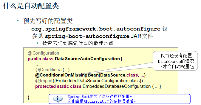 @ConditionalOnClass:是 Spring Boot 实现自动配置的重要支撑之一。其用途是判断当前 classpath 下是否 存在指定类,若是则将当前的配置装载入 spring 容器; --- @ConditionalOnMissingBean:在容器加载它作用的 bean 时,检查容器中是否存在目标类型 (ConditionalOnMissingBean 注解的 value 值)的 bean 了,如果存在跳过原始 bean 的 BeanDefinition 加载动作