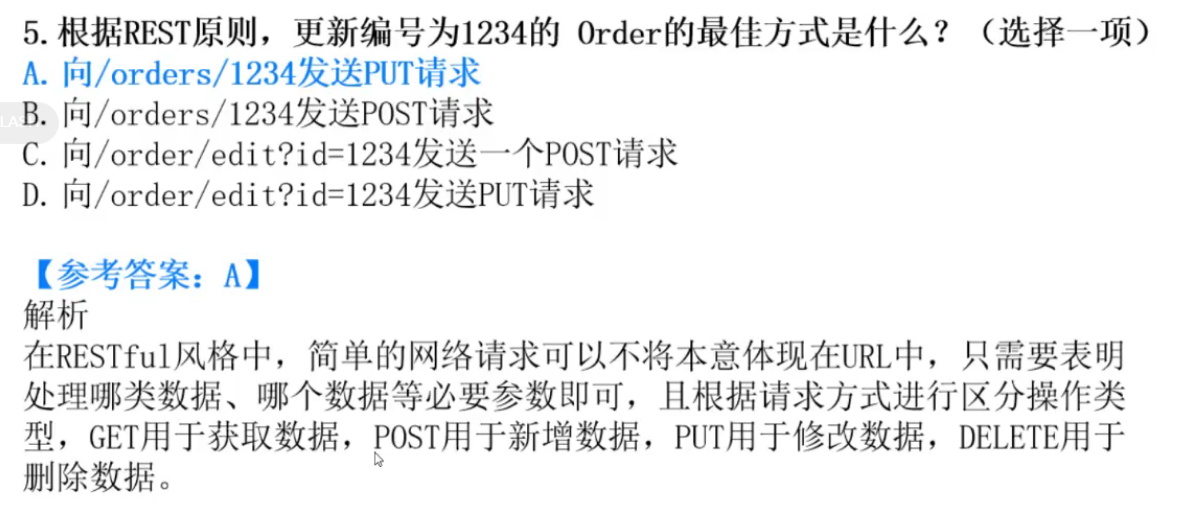 5.根据 REST 原则,更新编号为 1234 的 Order 的最佳方式是什么?(选择一项)A