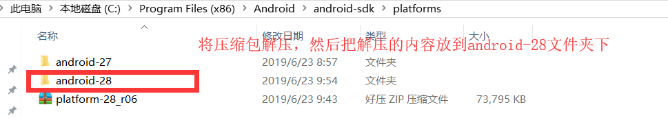 2)在C:\Program Files (x86)\Android\android-sdk\platforms下下新建android-28文件夹,再将对应的压缩文件的解压内容放到新建的文件夹中