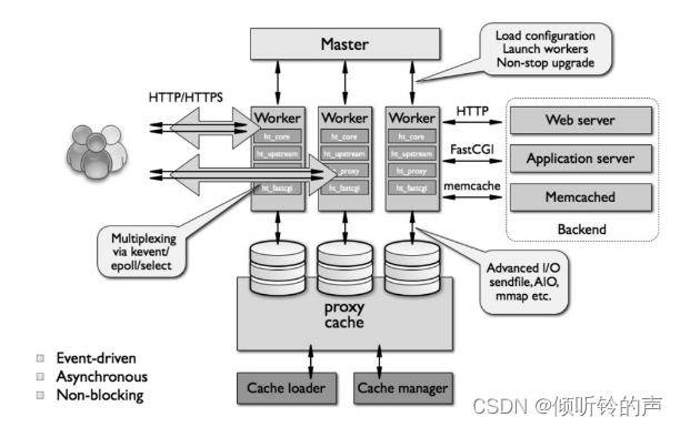 Nginx 大量使用多路复用和事件通知,Nginx 启动以后,会在系统中以 daemon 的方式在后台运行,其中包括一个 master 进程,n(n>=1) 个 worker 进程。所有的进程都是单线程(即只有一个主线程)的,且进程间通信主要使用共享内存的方式。