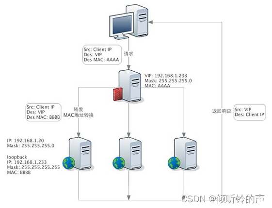 详细来看,一个请求过来时,LVS 只需要将网络帧的 MAC 地址修改为某一台 RS 的 MAC,该包就会被转发到相应的 RS 处理,注意此时的源 IP 和目标 IP 都没变,LVS 只是做了一下移花接木。RS 收到 LVS 转发来的包时,链路层发现 MAC 是自己的,到上面的网络层,发现 IP 也是自己的,于是这个包被合法地接受,RS 感知不到前面有 LVS 的存在。而当 RS 返回响应时,只要直接向源 IP(即用户的 IP)返回即可,不再经过 LVS。