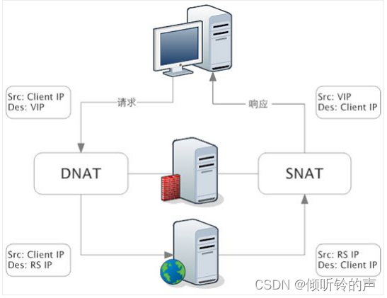 当包到达 LVS 时,LVS 做目标地址转换(DNAT),将目标 IP 改为 RS 的 IP。RS 接收到包以后,仿佛是客户端直接发给它的一样。RS 处理完,返回响应时,源 IP 是 RS IP,目标 IP 是客户端的 IP。这时 RS 的包通过网关(LVS)中转,LVS 会做源地址转换(SNAT),将包的源地址改为 VIP,这样,这个包对客户端看起来就仿佛是 LVS 直接返回给它的。