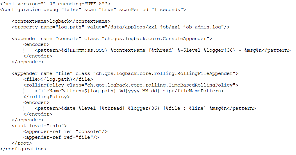 - 默认情况下,日志输出的地址是 /data/applogs/xxl-job/xxl-job-admin.log 。可以根据自己的需要,进行调整。