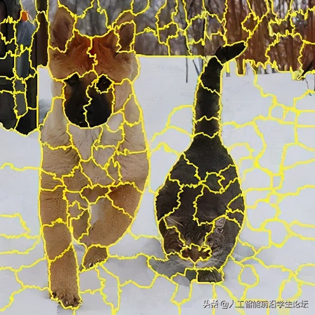 所以针对图像任务使用LIME时还需要一些特别的技巧,也就是考虑图像的空间相关和连续的特性。不考虑一些极小特例的情况下,图片中的物体一般都是由一个或几个连续的像素块构成,所谓像素块是指具有相似纹理、颜色、亮度等特征的相邻像素构成的有一定视觉意义的不规则像素块,我们称之为超像素。相应的,将图片分割成一个个超像素的算法称为超像素分割算法,比较典型的有SLIC超像素分割算法还有quickshit等,这些算法在scikit-image库中都已经实现好了,quickshit分割后如图所示: