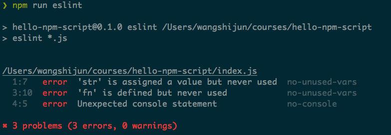 如果运行 npm run eslint,npm 会在 shell 中运行 eslint **.js。