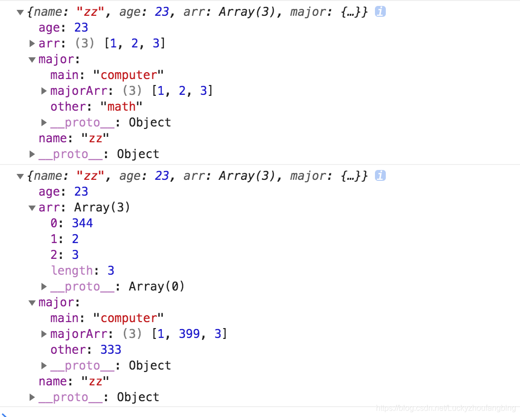 console.log(obj2.major.math) // zh两个对象指向同一个引用地址,其中一个变了,其他对象的相应字段也都会改变,这是浅拷贝