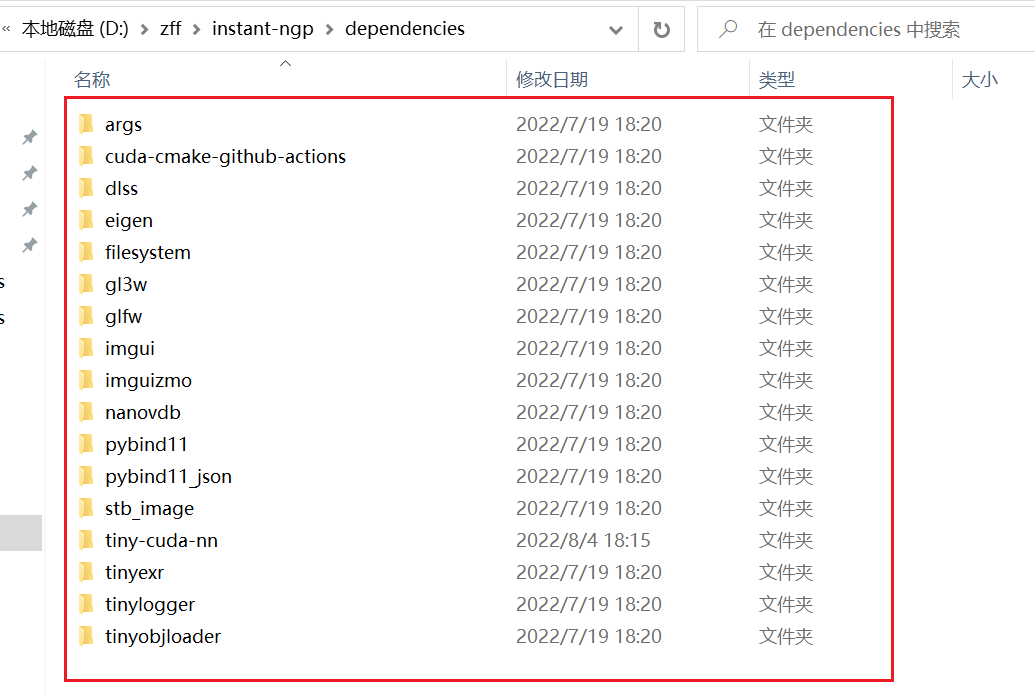在下载好instant-ngp文件夹中比对查看依赖项是否完全下载完整,重要事情说三遍:一定要确保文件下载完整!!!