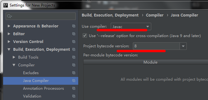 3. Other Settings—>Settings for New Projects—>搜索框输入java compiler,并打开,修改如下。
