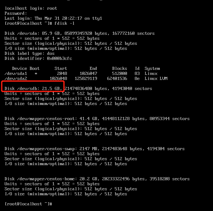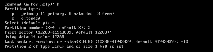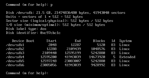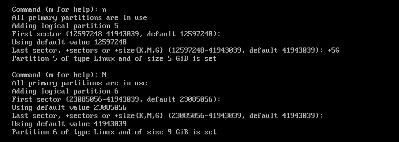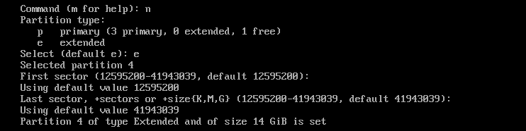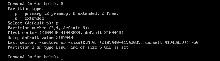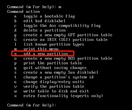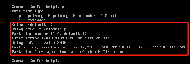 使用m查看详细命令,n添加一块新分区,默认最多只能有四个主分区,但可以通过设置将第四个分区作为扩展分区,/dev/sdb5、/dev/sdb6等作为逻辑分区,其中p为主分区,e为扩展分区。需要注意逻辑分区最后一分区,使用默认大小,即将硬盘容量全部分配出去,防止浪费硬盘。