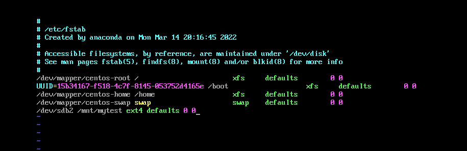 /dev/sdb2 /mnt/mytest ext4 defaults 0 0