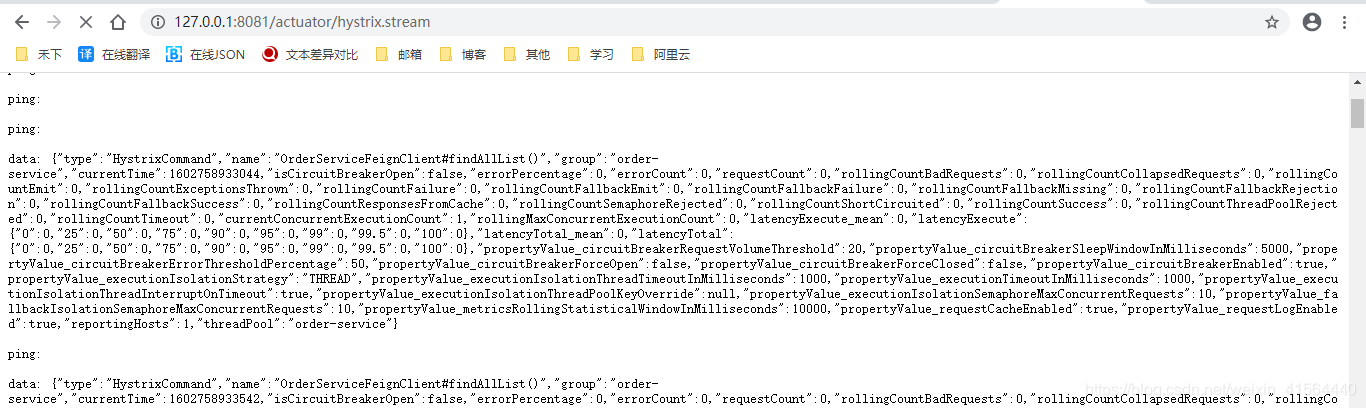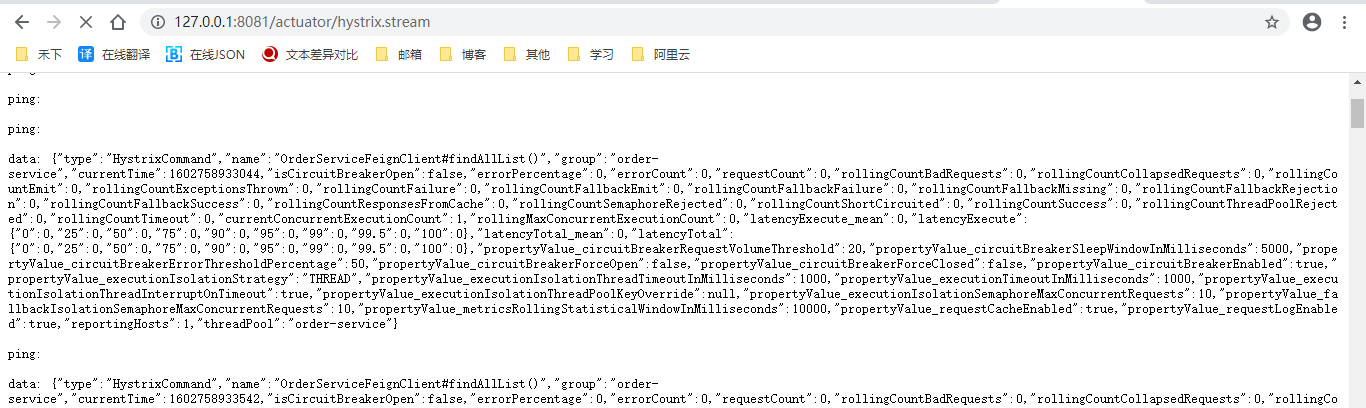 访问http://127.0.0.1:8081/actuator/hystrix.stream正常,可以看见user-service项目不断的ping获取信息