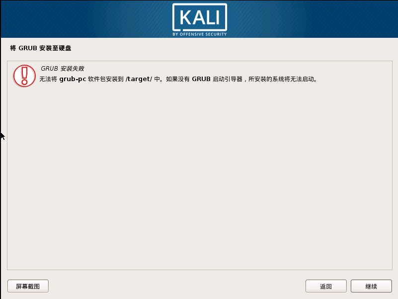 # 无法将grub-pc软件包安装到/target/中,如果没有GRUB启动引导器,所安装的系统将无法启动。