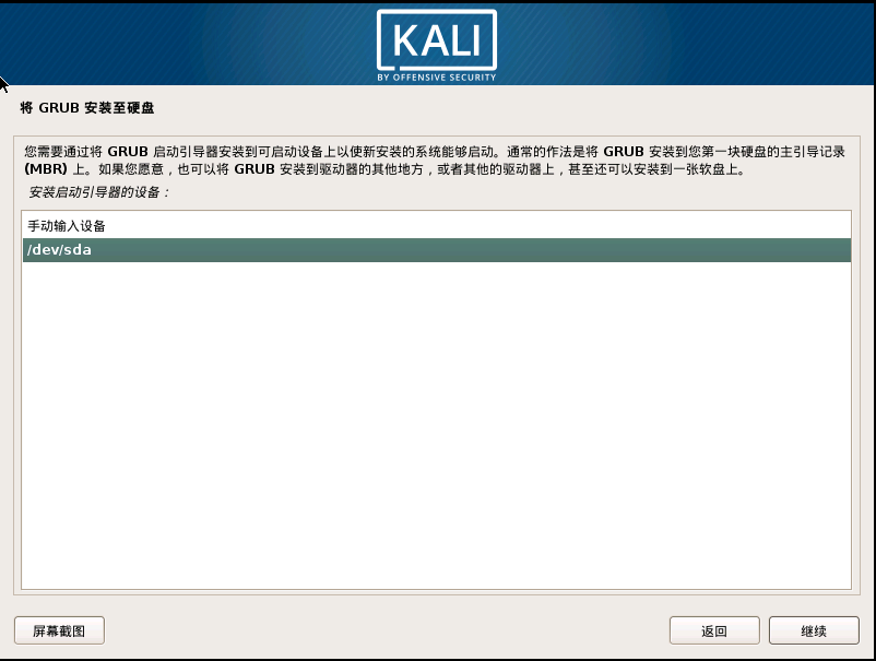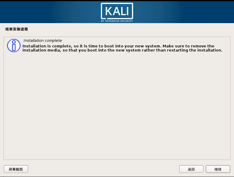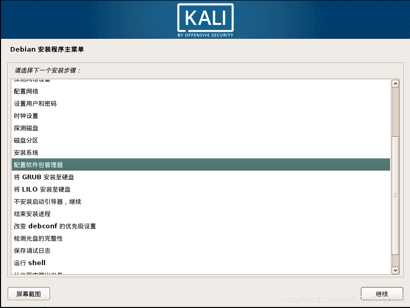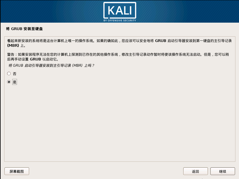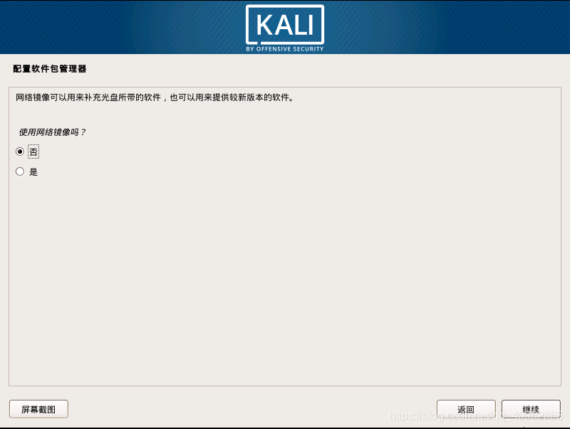 将之前设置的网络镜像“是”改为“否”,点击继续,安装成功后,再去kali Linux操作系统下,安装“更新源”也是可以的。