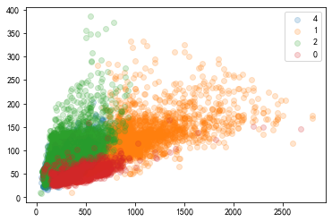 plt.scatter(x, y, label = str(label), alpha = 0.2)