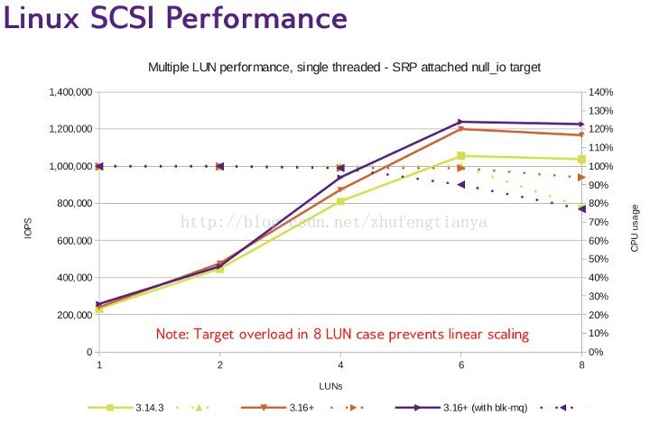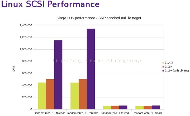 很对测试和研究表明,Blk-mq/SCSI-mq对存储设备的Performance将有很大的提升,想要更多的了解Blk-mq/SCSI-mq见这篇文章,下图显示了加入了Blk-mq/SCSI-mq后Linux-SCSI Performance
