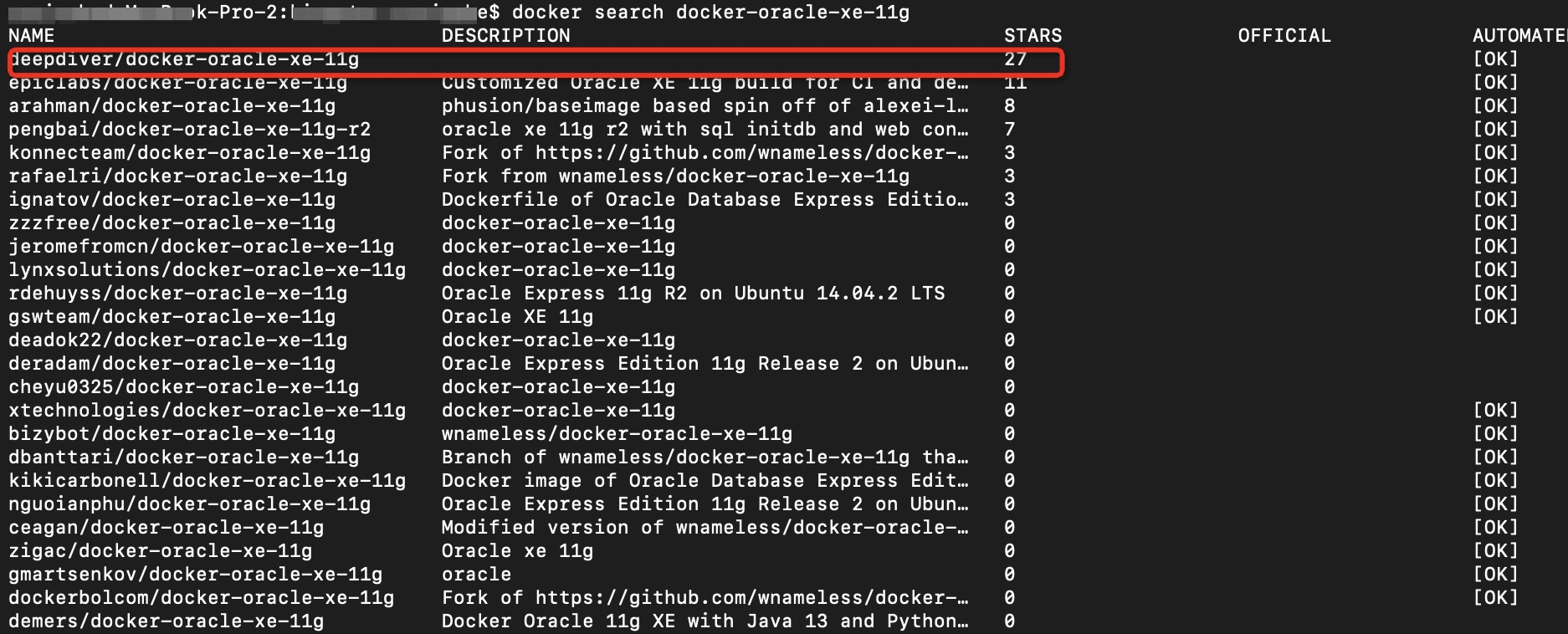 (1)Docker是一个容器,在容器内部存在很多镜像文件,通过具体的镜像文件可以运行具体的容器。要想在Docker中安装Oracle镜像,我们首先应该在Docker的远程仓库中进行搜索,因为Docker没有自带Oracle相关镜像,命令如下(根据你Mac的实际情况决定是否要加sudo):