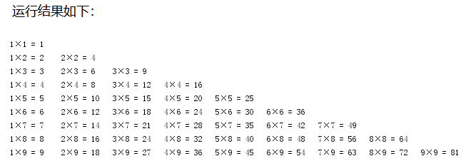 九九乘法表对于刚接触不久的小白来说,确实是一个不错的练习题,如果学到了for循环的朋友们,建议练一下九九乘法表,很有意思,而且等后面接触到列表生成式后,可以用一行代码就可以实现,是不是两眼放光呢,下面咱们说下两种表达方式: