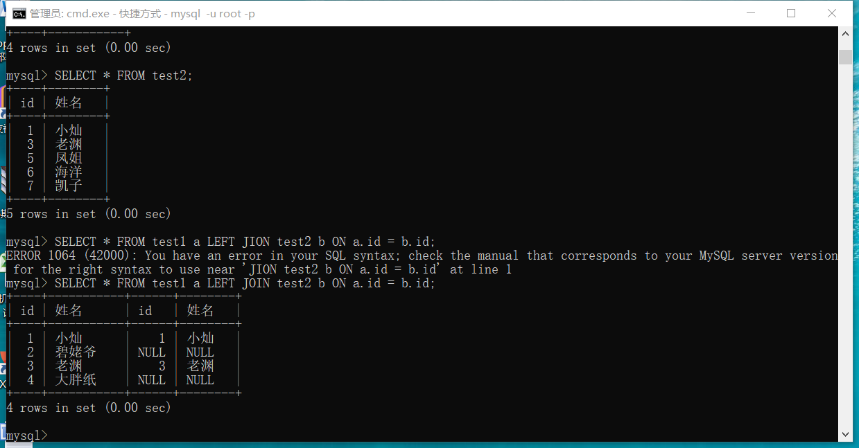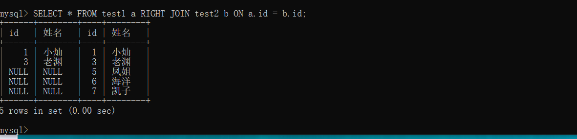 解释下就是以左边表id(案例里面是test1)为基础和右表id对比,左表有的右表也有就也出来,右表没有的就NULL咯,右连接和左连接相反