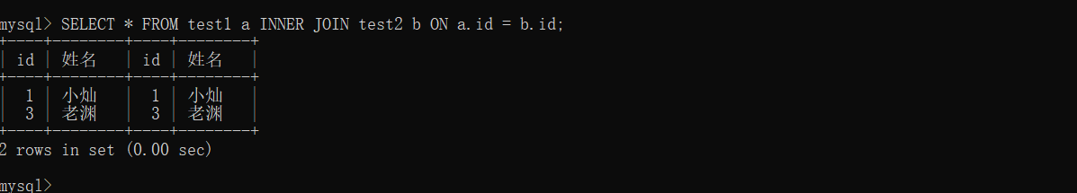 内连接:SELECT * FROM test1 a INNER JOIN test2 b ON a.id = b.id;