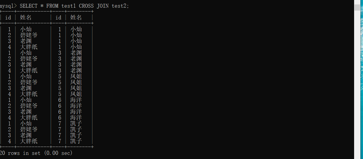交叉连接:SELECT * FROM test1 CROSS JOIN test2;