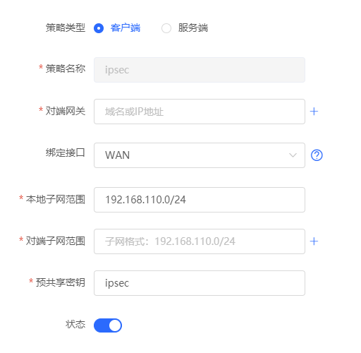 3.对端网关,填写服务端WAN口IP。
