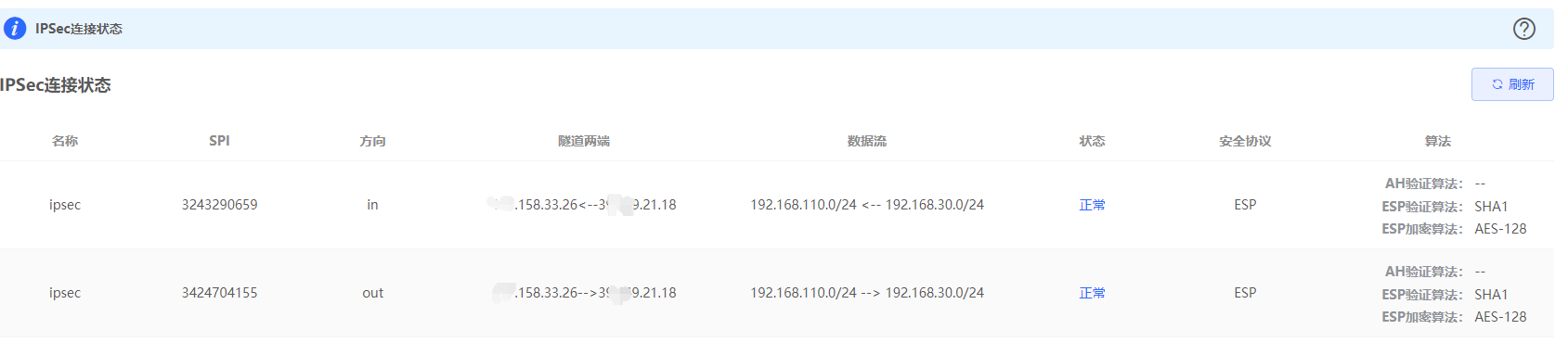 阶段1和阶段2设置于总部一样,设置完成,查看IPSEC连接状态(即ipsec SA安全联盟)。