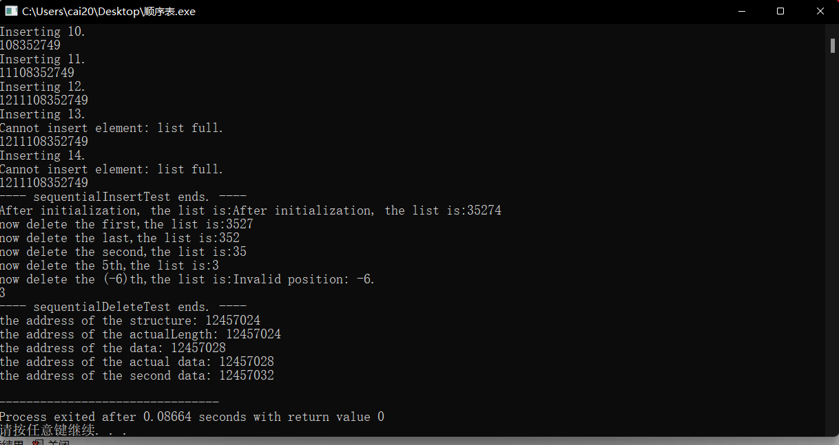 }//of sequentialListInsert插入之后我们还要设计一个测试插入的函数来验证: