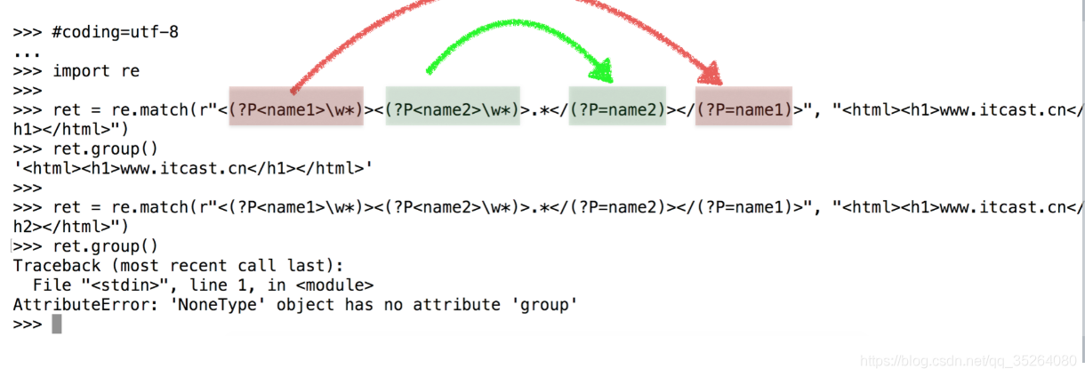 ret = re.match(r"<(?P\w*)><(?P\w*)>.*</(?P=name2)></(?P=name1)>", “