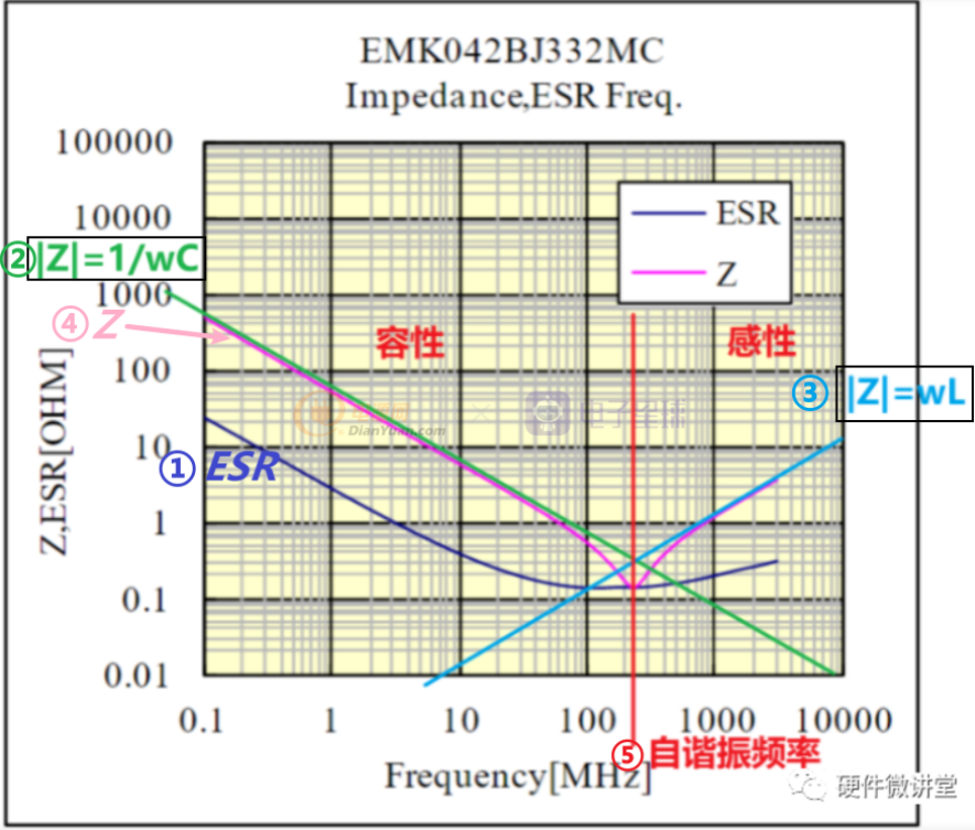 4、粉红色曲线④为电容(实际模型)的阻抗频率曲线;