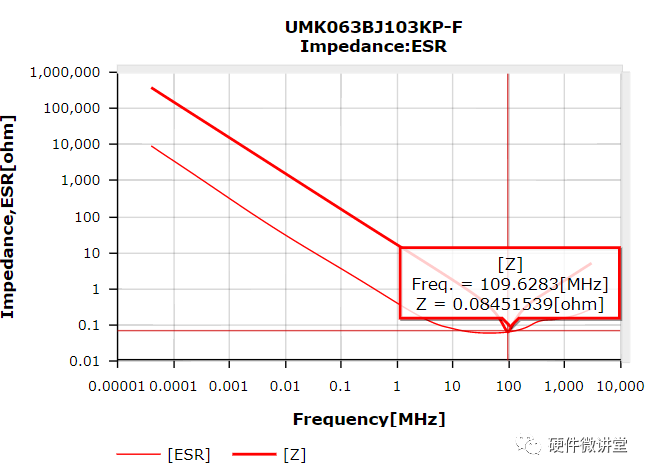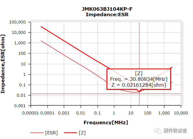 针对文章开头抛出来的面试题,结合上面的描述,我们一起看下100nf电容的阻抗频率特性曲线。下图是Taiyo的JMK063BJ104KP-F(100nf),从曲线中可以看出,自谐振频率为30MHz,此时的ESR为21.6mΩ。