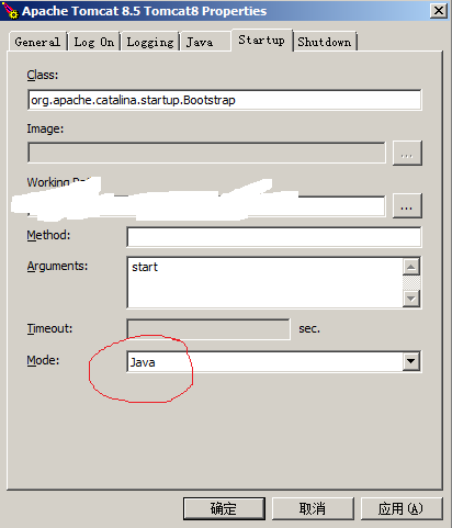 (1)执行xxx(tomcat安装目录)/bin/tomcat8W.exe 进入图形界面,在“Startup”页签下,更改“Mode”选项,三种选项都尝试一下。如下图:
