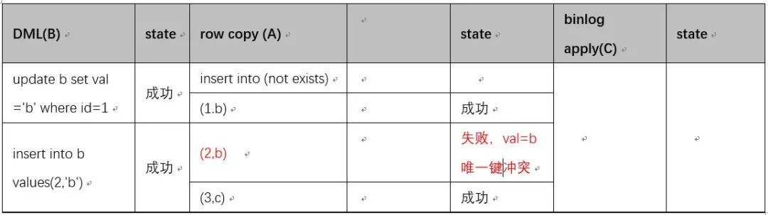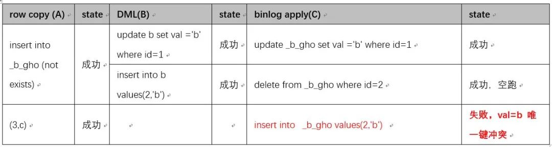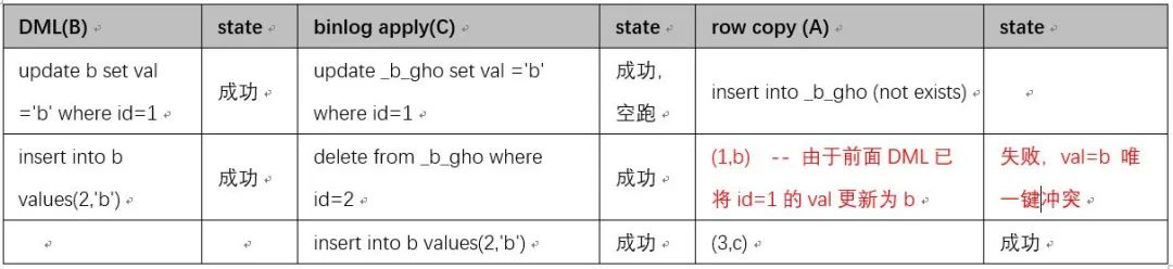 下面对原数据拷贝(A),原表DML(B),Binlog应用到新表(C) 三个过程先后顺序不固定时做下推演。首先C肯定在B后面,因此可能的顺序是ABC,BCA,BAC 三种可能情况。