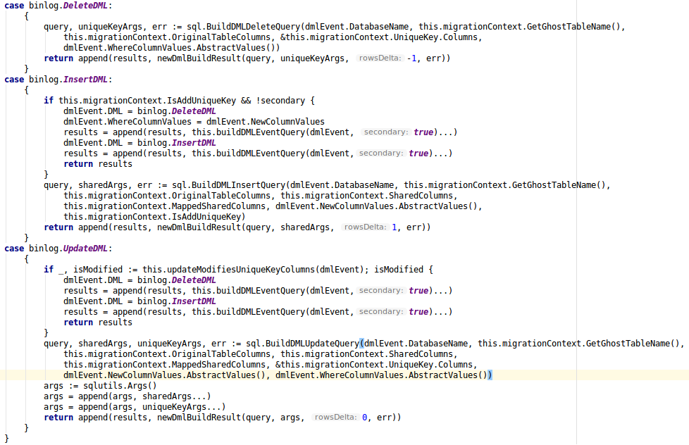 因为这里会对insert语句做调整,首先我们拷贝的insert into会改写成insert ignore into,而binlog内insert into会改写成replace into,这样可以很好的支持两个goroutine的并行。但这样的调整能适用所有的DDL吗?答案是否定的,大家可以思考下,下面案例部分会给出详细解释。