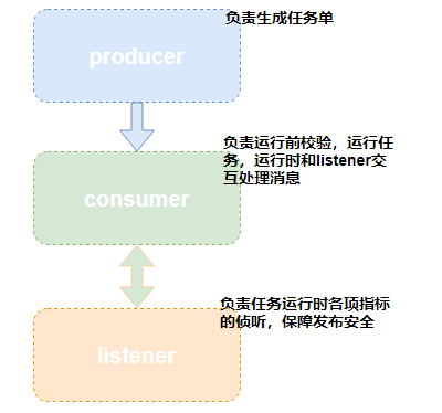 为了确保每次发布符合数据库规范,确保发布可以顺利完成,发布前我们做了很多检查工作,发布过程中会有线程实时侦听发布状态。通过producer,consumer,listener如下三个组件来协同完成发布的顺利进行。