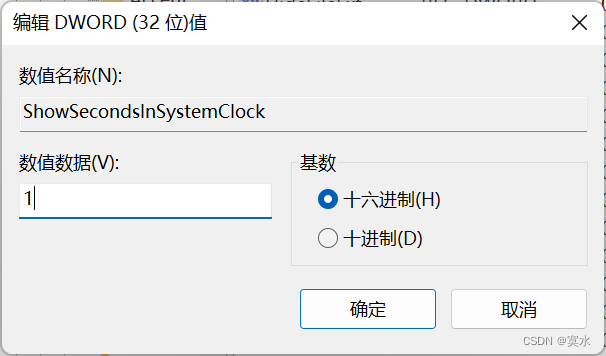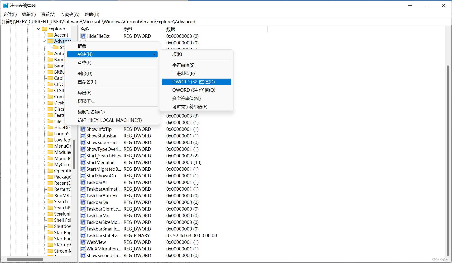计算机\HKEY_CURRENT_USER\Software\Microsoft\Windows\CurrentVersion\Explorer\Advanced四、新建一个DWORD(32位)值(D),命名为ShowSecondsInSystemClock,将数值修改为1,点击确定