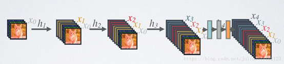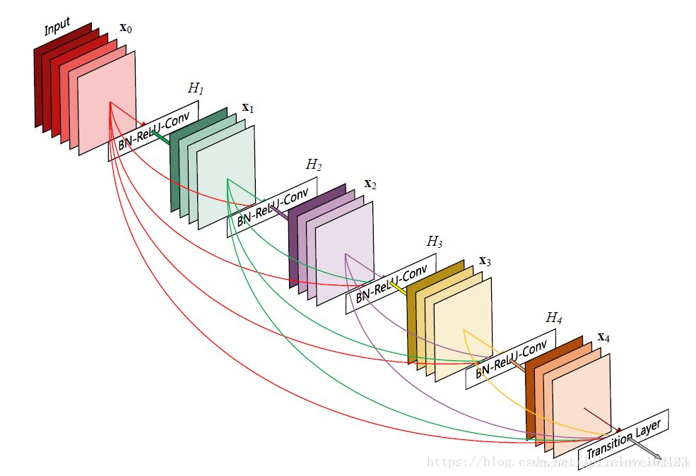 其中,上面的Hl(.)代表是非线性转化函数(non-liear transformation),它是一个组合操作,其可能包括一系列的BN(Batch Normalization),ReLU,Pooling及Conv操作。注意这里L层与L-1层之间可能实际上包含多个卷积层