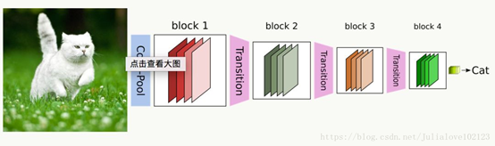 CNN网络一般要经过Pooling或者stride>1的Conv来降低特征图的大小,而DenseNet的密集连接方式需要特征图大小保持一致。为了解决这个问题,DenseNet网络中使用DenseBlock+Transition的结构,其中DenseBlock是包含很多层的模块,每个层的特征图大小相同,层与层之间采用密集连接方式。而Transition模块是连接两个相邻的DenseBlock,并且通过Pooling使特征图大小降低。图4给出了DenseNet的网路结构,它共包含4个DenseBlock,各个DenseBlock之间通过Transition连接在一起。