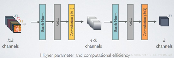 由于后面层的输入会非常大,DenseBlock内部可以采用bottleneck层来减少计算量,主要是原有的结构中增加1x1 Conv,如图7所示,即BN+ReLU+1x1 Conv+BN+ReLU+3x3 Conv,称为DenseNet-B结构。其中1x1 Conv得到4k个特征图它起到的作用是降低特征数量,从而提升计算效率。