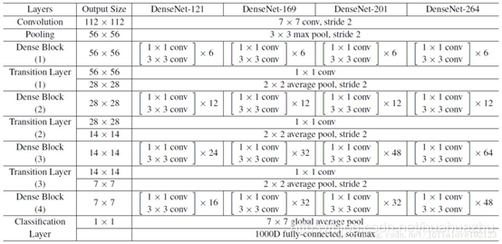 对于ImageNet数据集,图片输入大小为224*224,网络结构采用包含4个DenseBlock的DenseNet-BC,其首先是一个stride=2的7x7卷积层(卷积核数为2K),然后是一个stride=2的3x3 MaxPooling层,后面才进入DenseBlock。ImageNet数据集所采用的网络配置如表1所示: