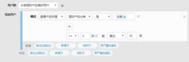 说明:通过条件设置,在最近30天内搜索并查看长期理财产品分类及详情页大于等于3次的用户筛选出来,定义为有长期理财产品偏好的用户,可以针对这一客群进行潜在用户的二次营销,比如为其推送长期理财产品的加息券等,鼓励其完成投资。