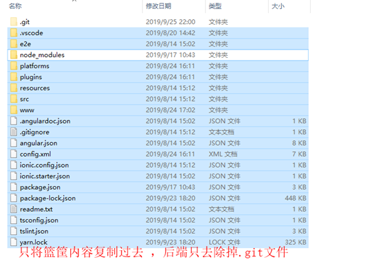 将我们需要push到远程的代码放到我们克隆文件夹中(带有隐藏的.git文件同级目录),复制过程中将原先文件夹附带的 .git文件、node_modules文件去除!