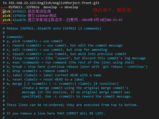 第二步:将找到ID这一行前面的pick改为drop,修改完后我们按下“ESC”表示不能修改了