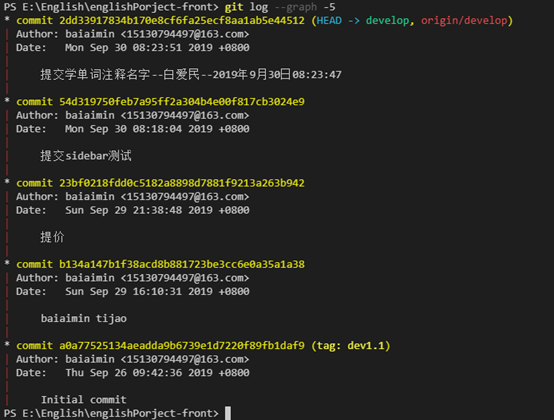 # 查看一条线整个提交历史最近5条 ,去掉-5表示整个历史记录