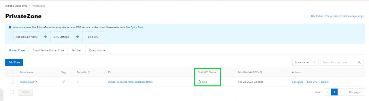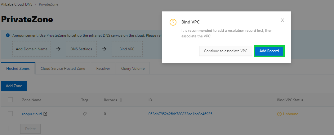 - 第 4 步:选择Bind VPC并单击Add Record: