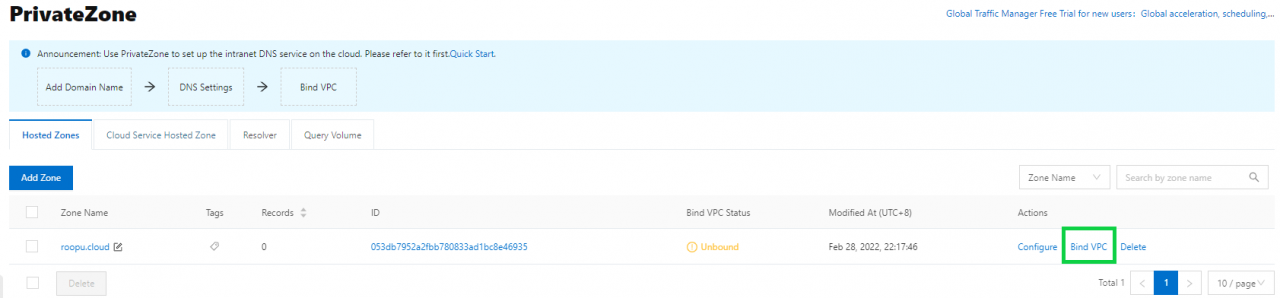 - 第七步:添加记录后,回到私有区域设置绑定一个VPC: