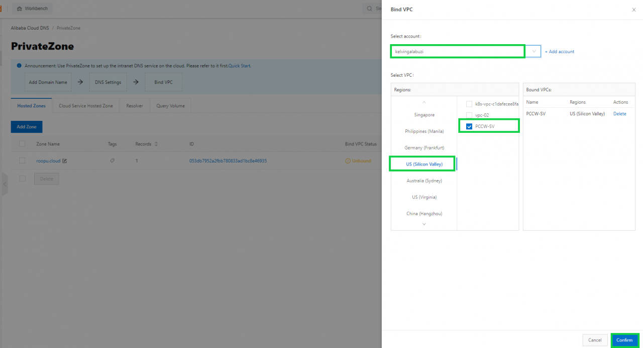 - 步骤 8:如果您要绑定虚拟私有云 (VPC),请选择您的账户、VPC 区域、特定 VPC,然后单击确认: