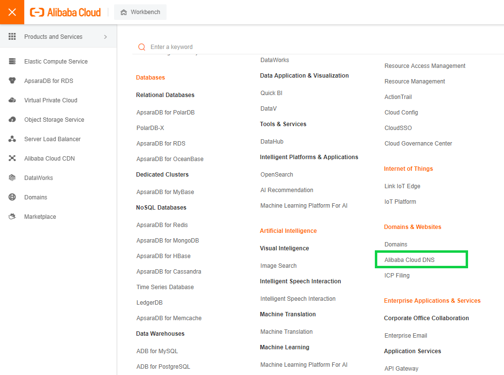 - 第一步:在阿里云控制台中,访问阿里云DNS服务: