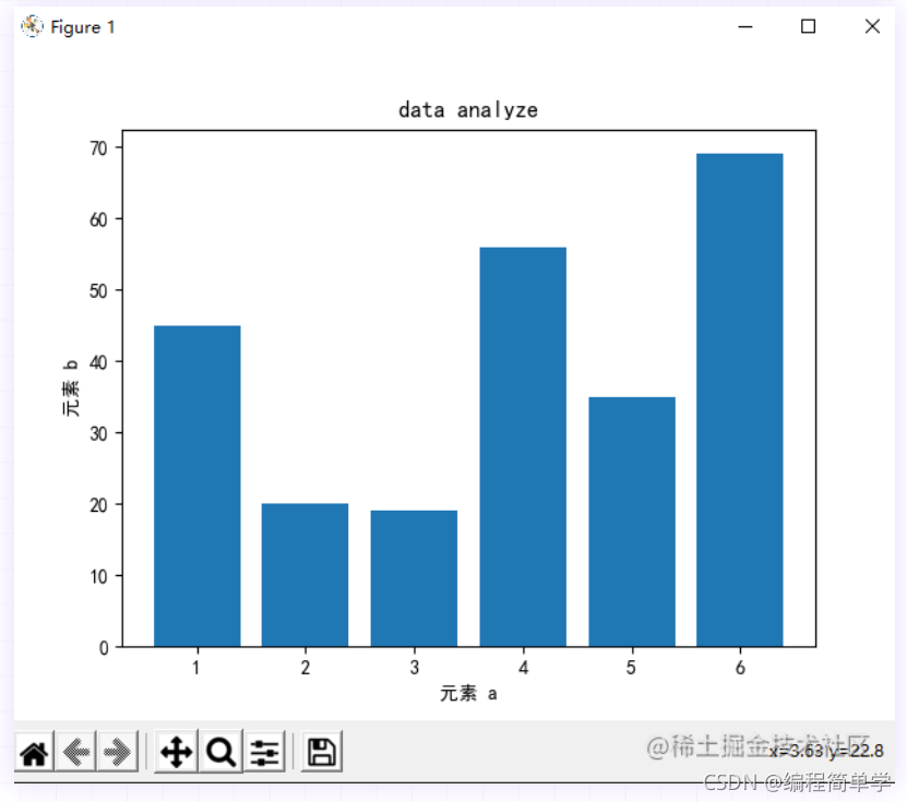 from matplotlib import pyplot import pandas pyplot.rcParams["font.sans-serif"]=['SimHei'] pyplot.rcParams["axes.unicode_minus"]=False pyplot.bar([1,2,3,4,5,6],[45,20,19,56,35,69]) pyplot.title("data analyze") pyplot.xlabel("元素 a") pyplot.ylabel("元素 b") pyplot.show()