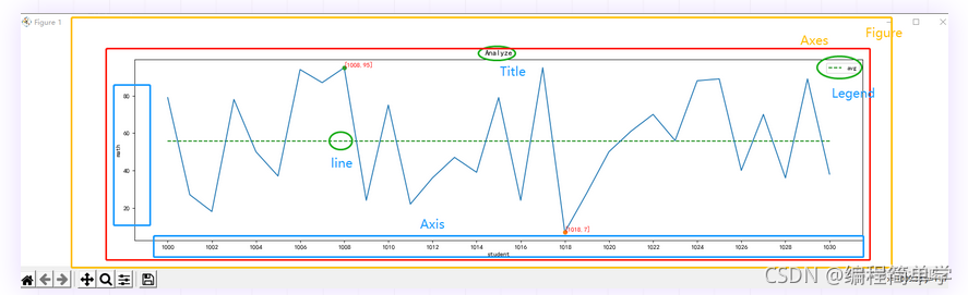 我们可以通过如下matplotlibe图表中可以看到一张图表由多个对象组合而成的。